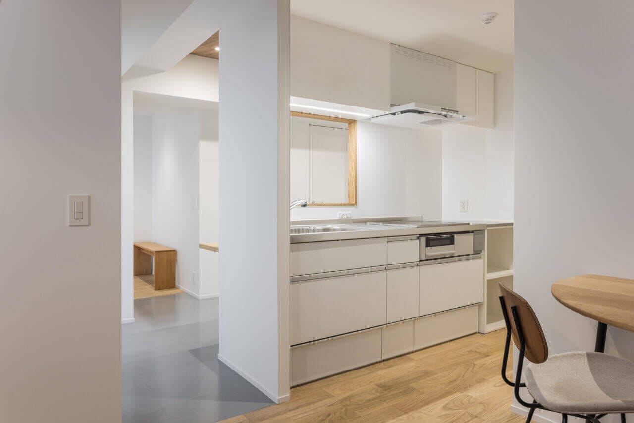 単身者向けのワンルームマンションを2つ繋げ1つの空間にすることで多人数世帯への対応を可能に。また、水まわりも1箇所に集約させることでメンテナンス性を高めるプランです。また、マンション住まいの方にとって収納は限られたスペースを快適に有効活用するための大切な要素。壁の中に収納できる建具により、住み手に配慮が行き届いた設計を展開しています。